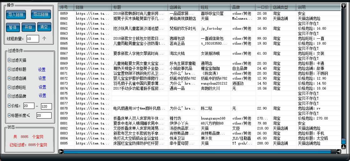 应用多线程 哈希表 正则 JS等,某宝数据过滤软件,适合新手学习参考。虽然简单,但是,是商用成品软件,现在很多工作室还都在使用!本人也是才学习易语言几个月,边学边写的,过滤速度还是挺快的。感谢大神优化源码写法和指出BUG!