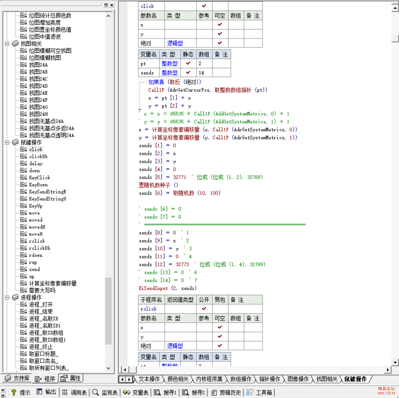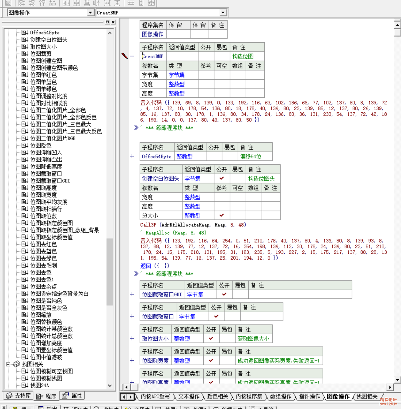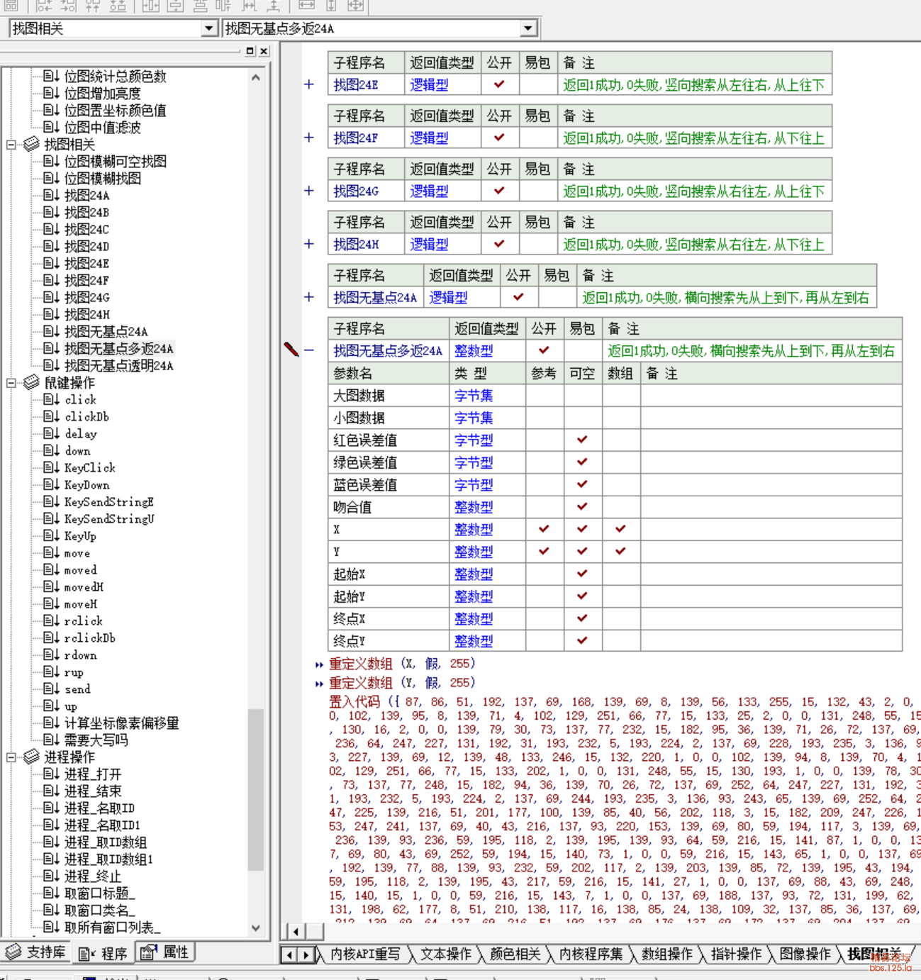 通过纯汇编,创建位图,截取窗口位图,汇编二值化位图,汇编浮雕位图,汇编位图去杂点等等这些命令,非常实用在做位图识别,位图找字,找色等,速度我不敢说第一,但是想求你们找一个第一把我比下去.找图功能方面,都是100%的纯汇编代码,无任何杂质.注意一下缺点,就是理论上只能处理24位 32位的位图