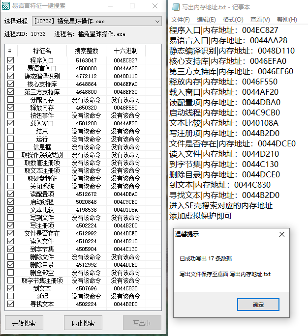 不过 这次是直接代替手动OD搜索 自动搜索出特征码 十六进制 地址